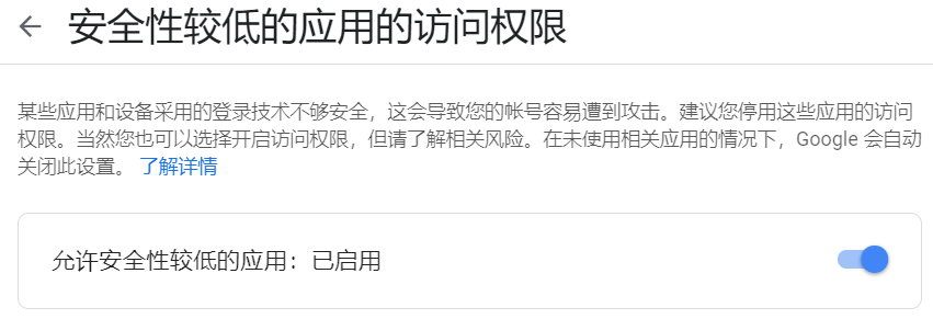 1、登录:https://myaccount.google.com/lesssecureapps 地址开启“安全性较低的应用的访问权限”